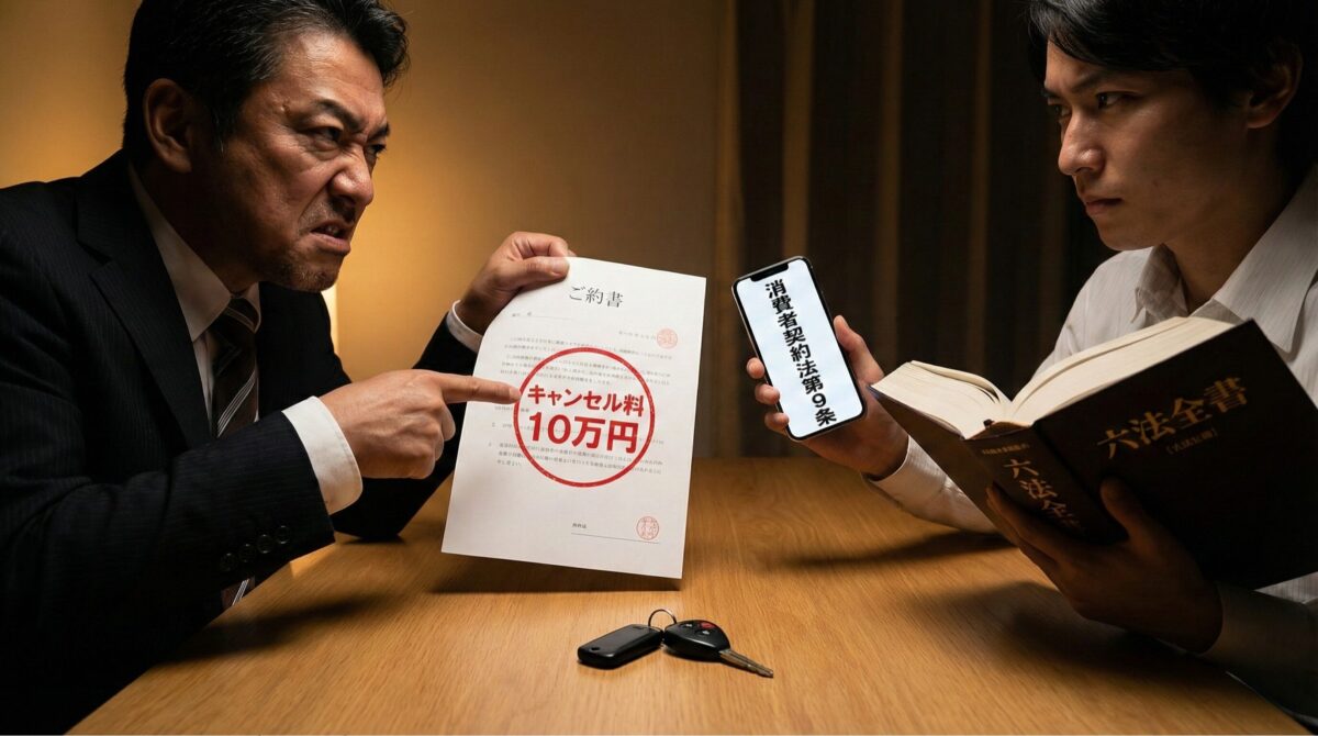つまり、業者があなたに請求できるのは、「実際に発生した実費(損害)」だけです。 まだ車を引き渡していない段階であれば、業者の損害はせいぜい「人件費」や「印紙代」程度。数千円の話です。 それにも関わらず、根拠なく「一律10万円」や「査定額の10%」を請求する条項は、この法律に照らし合わせれば無効になる公算が極めて高いのです。